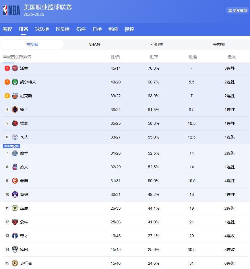 东部相对来说,竞争压力更大!活塞队一枝独秀,45胜14负,领先第2的绿军5.5场胜负差,基本上坐稳了东部第1的位置!绿军40胜20负,领先第3的尼克斯1.5场,第2的席位还有悬念,而骑士队,试图冲击第3名!